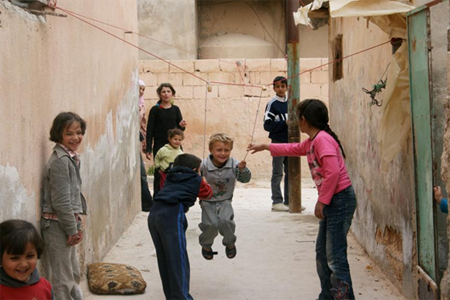 | Talbieh refugee camp, Jordan / UNRWA Archives Children play on a self-made swing in Jordan’s Talbieh refugee camp. |